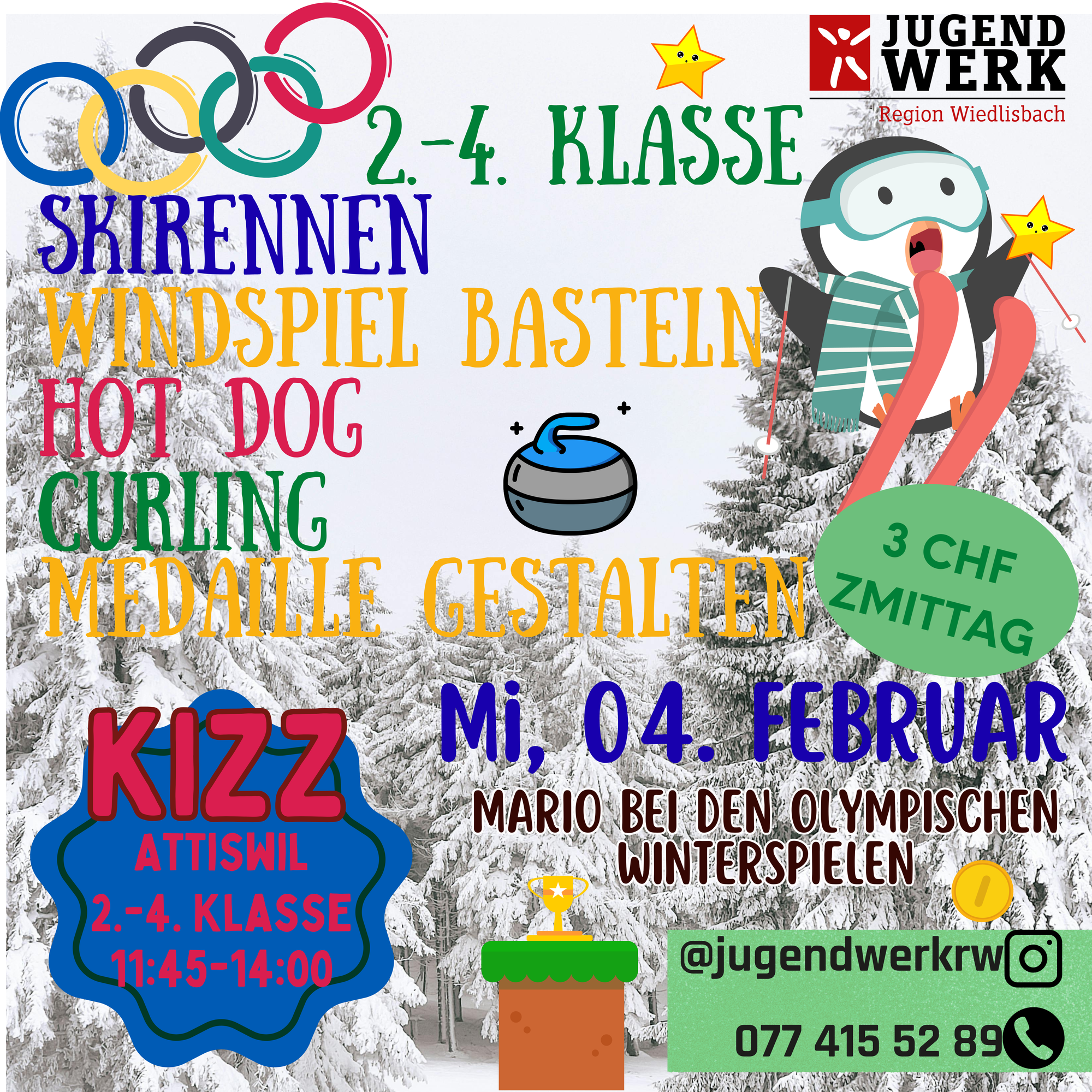 Es erwarten euch Winterspiele, ein Windspiel herstellen, Medaille gestalten, leckere Hotdogs und vieles mehr..