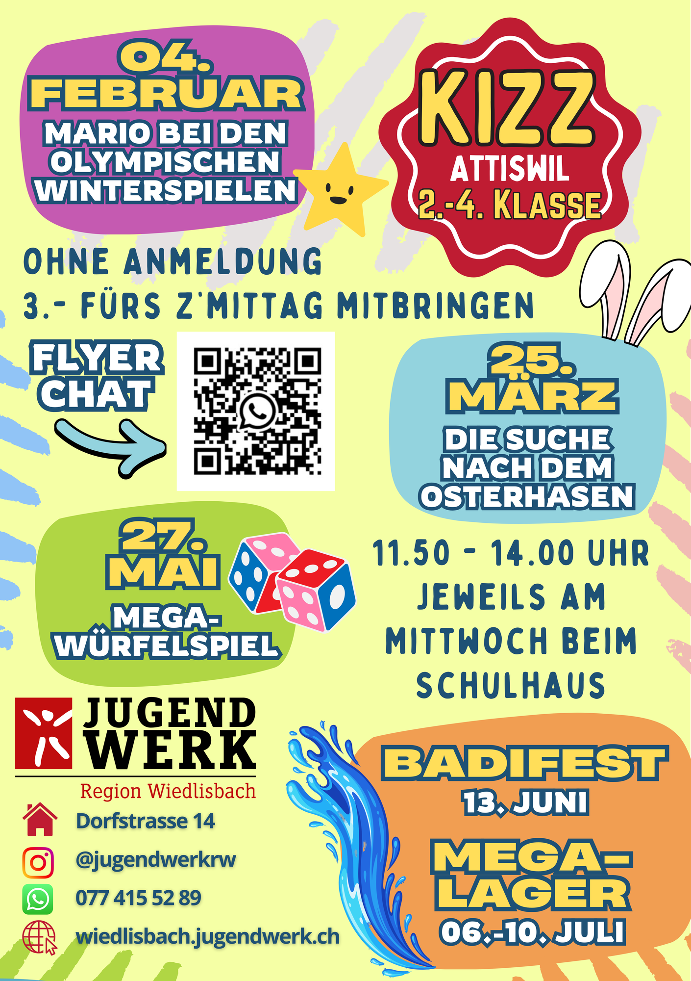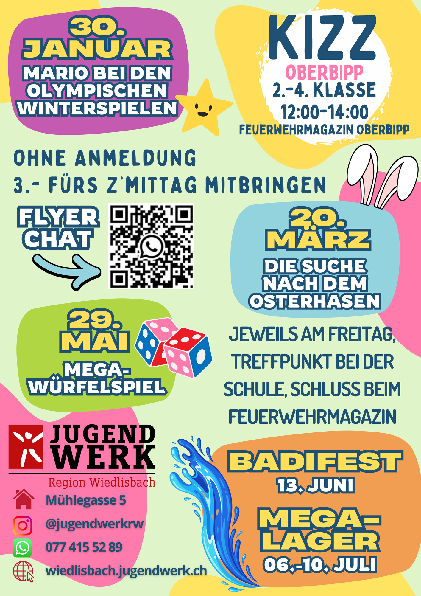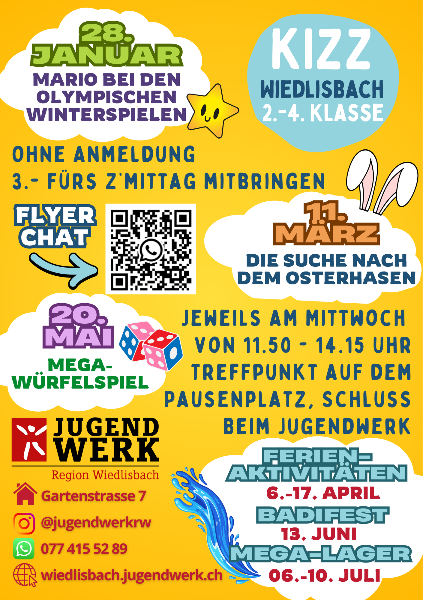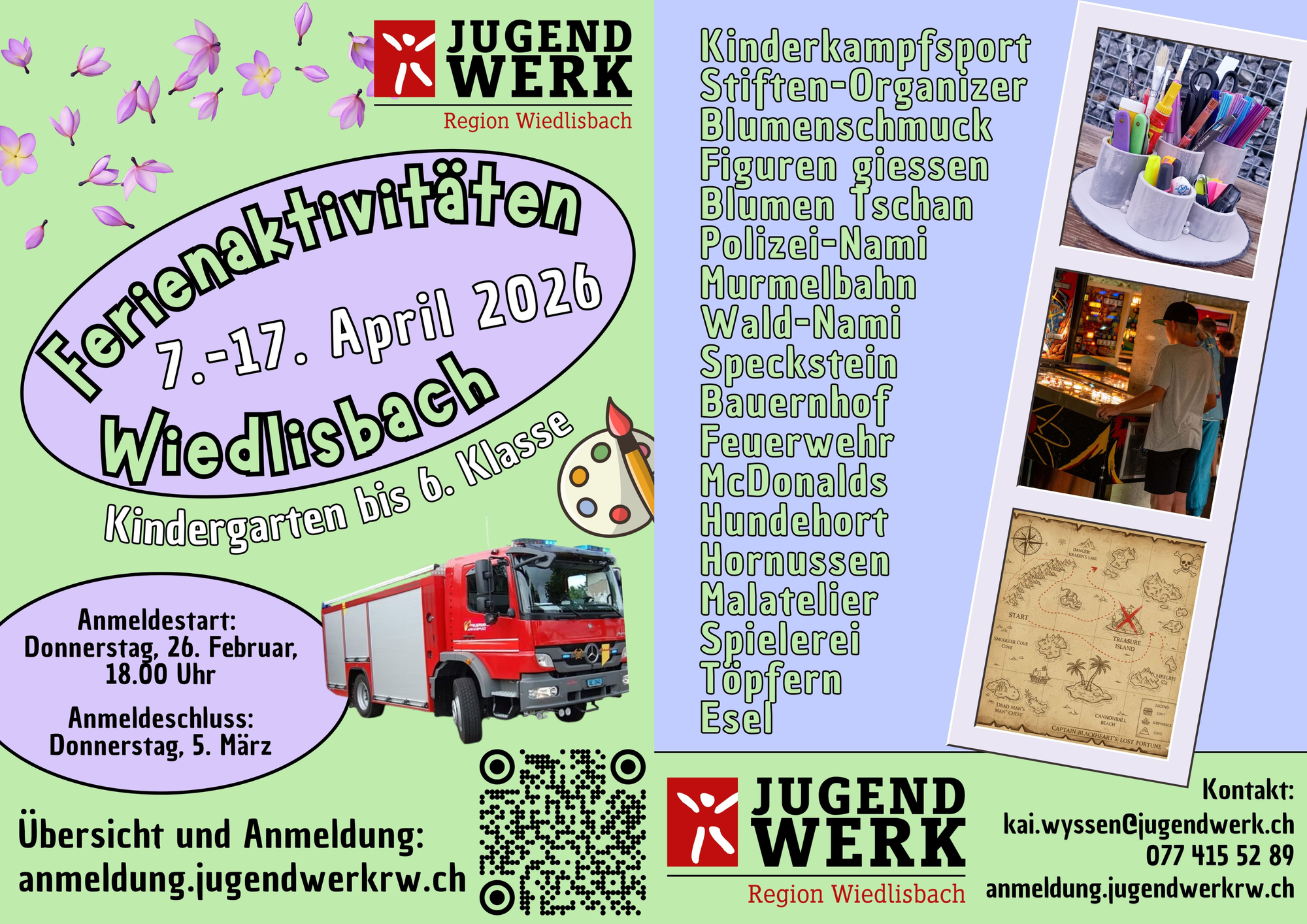 In den Frühlingsferien finden für die Kinder aus Wiedlisbach vom Kindergarten bis zur 6. Klasse wieder die Ferienaktivitäten statt. In diesem Jahr warten viele neue Angebote auf euch! Die einzelnen Angebote sind unter anmeldung.jugendwerkrw.ch ersichtlich, das Anmeldefenster öffnet am Donnerstag, 26. Februar.