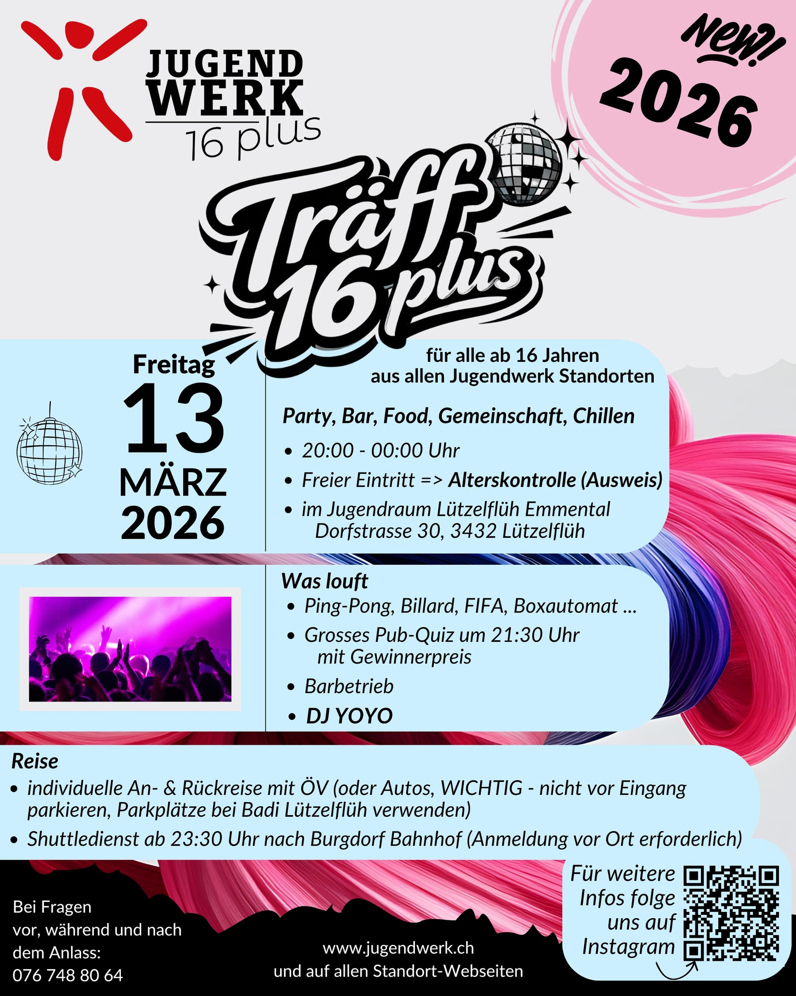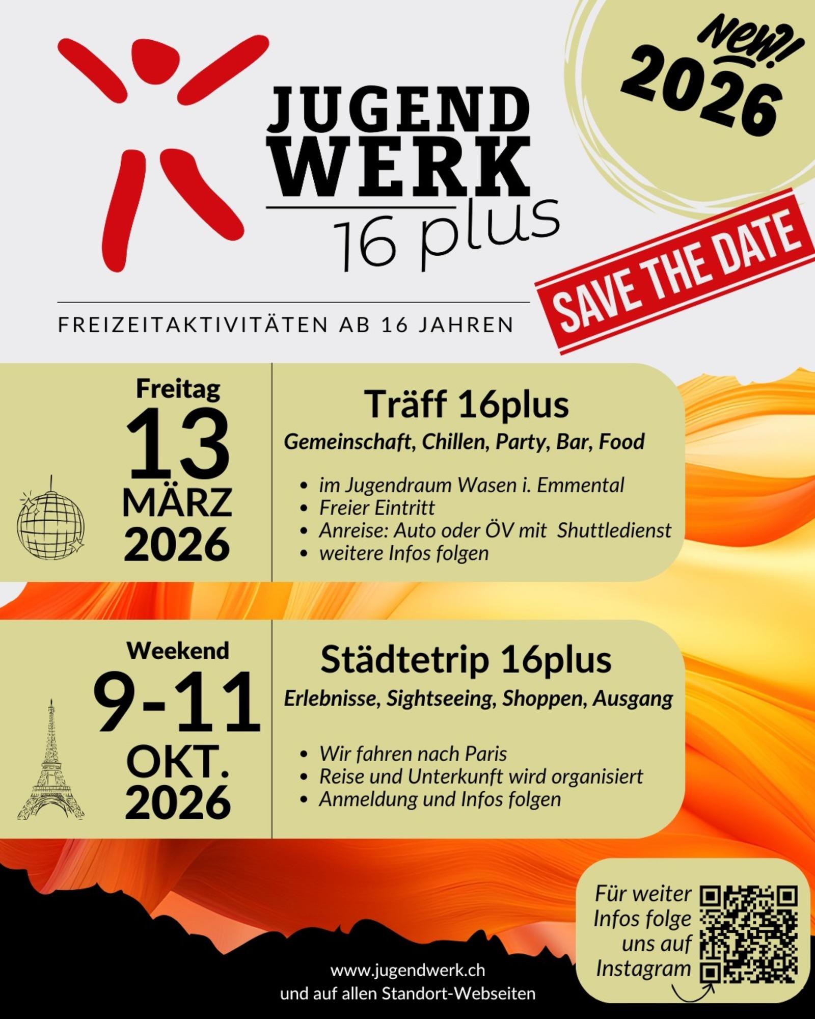 Das Jugendwerk gestaltet Standortübergreifend, zusammen mit einem Team aus freiwilligen jungen Erwachsenen, Angebote ab 16 Jahren. Im Zentrum von 16plus stehen Gemeinschaft, Begegnung und das gemeinsame Erleben von Freizeit. Die Angebote schaffen Raum für abwechslungsreiche Aktivitäten, spannende Erfahrungen und besondere Momente, die in Erinnerung bleiben.